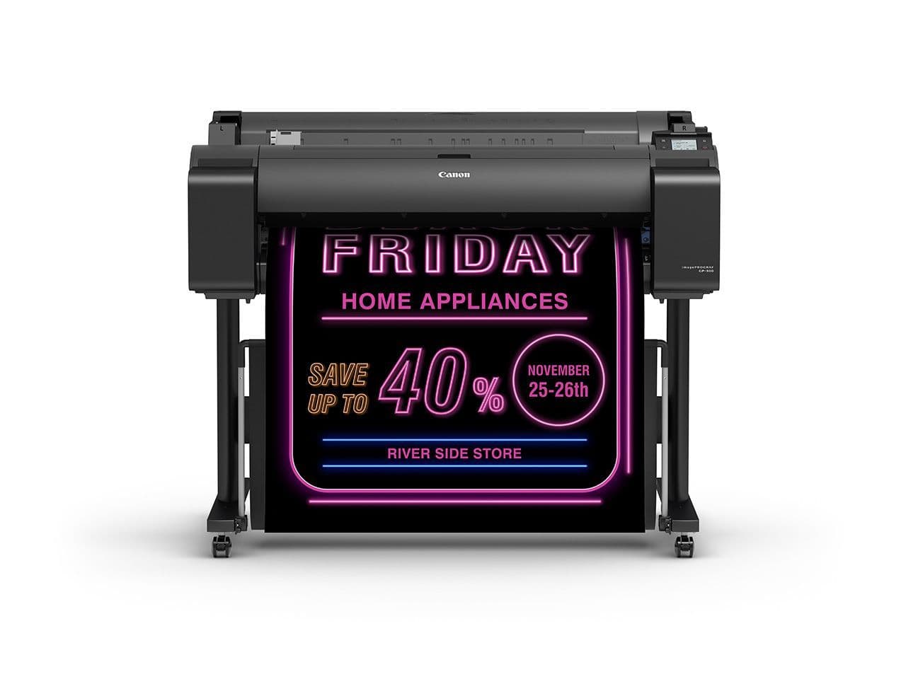 The Canon GP-300 is the world’s first large format printer with aqueous pigment Fluorescent Pink ink.